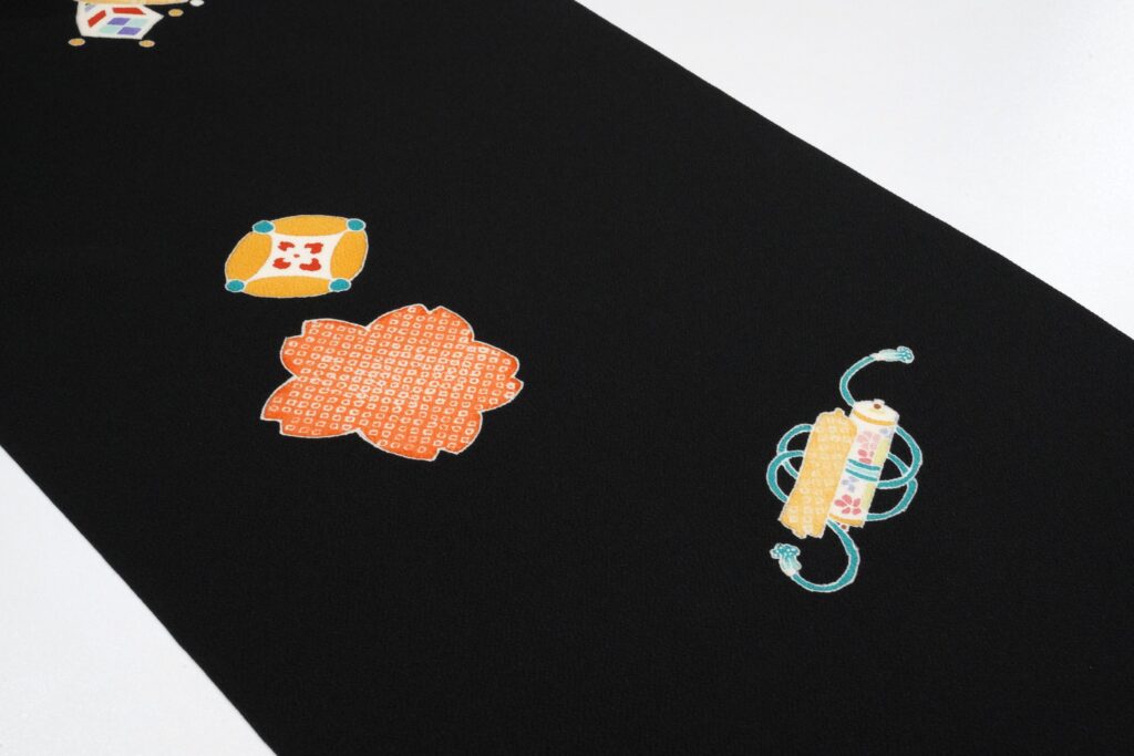 宝尽くし文様の宝物たちが染め上げられています。