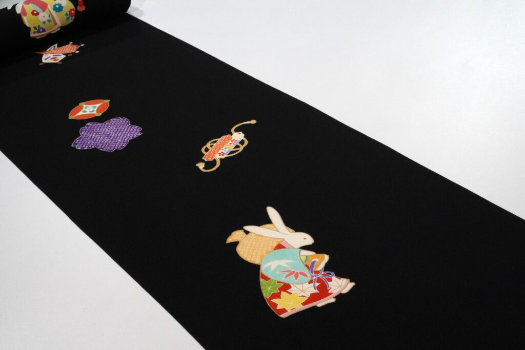 黒地の上に、うさぎを染め上げた一反。