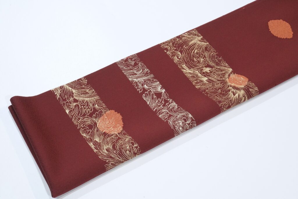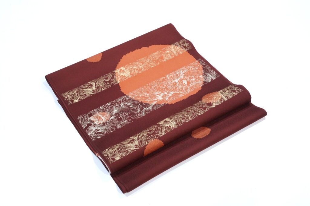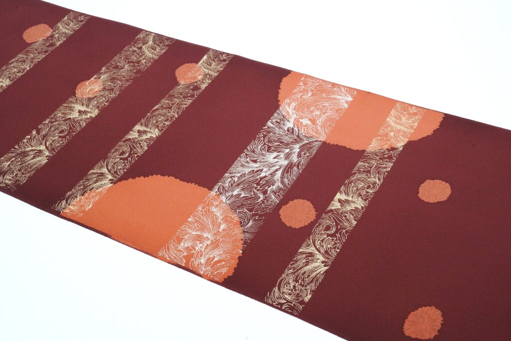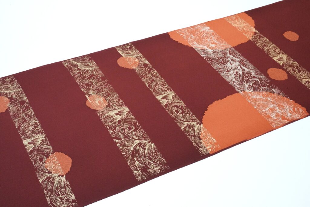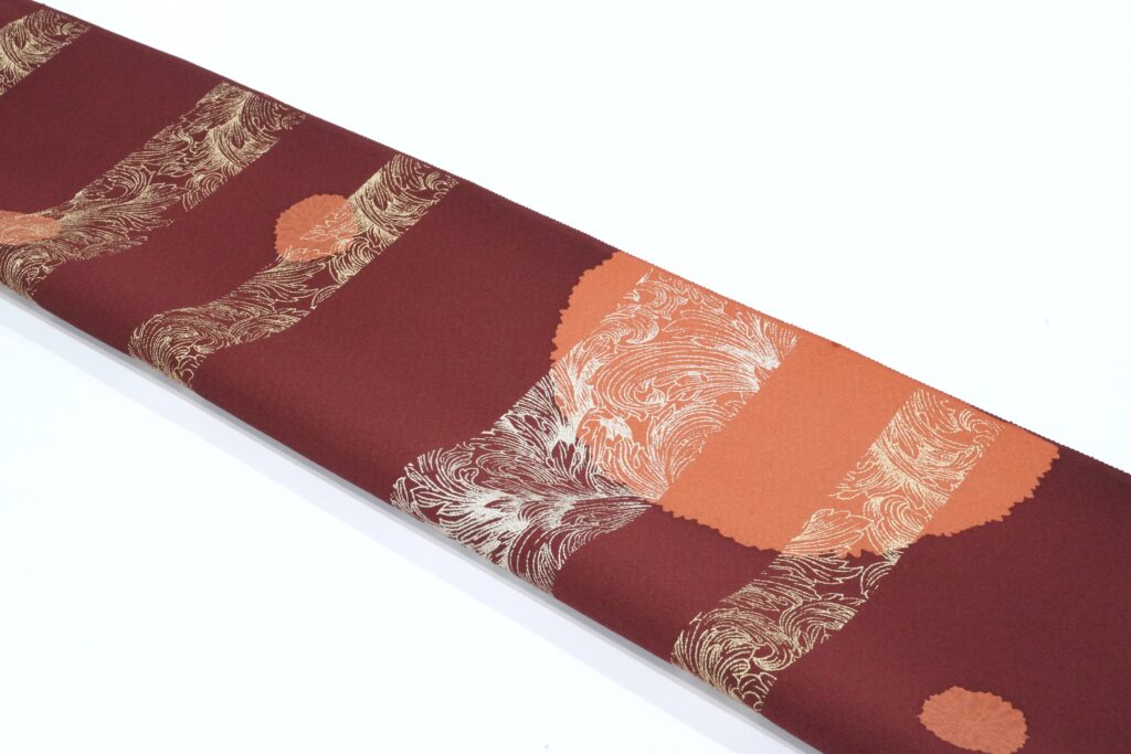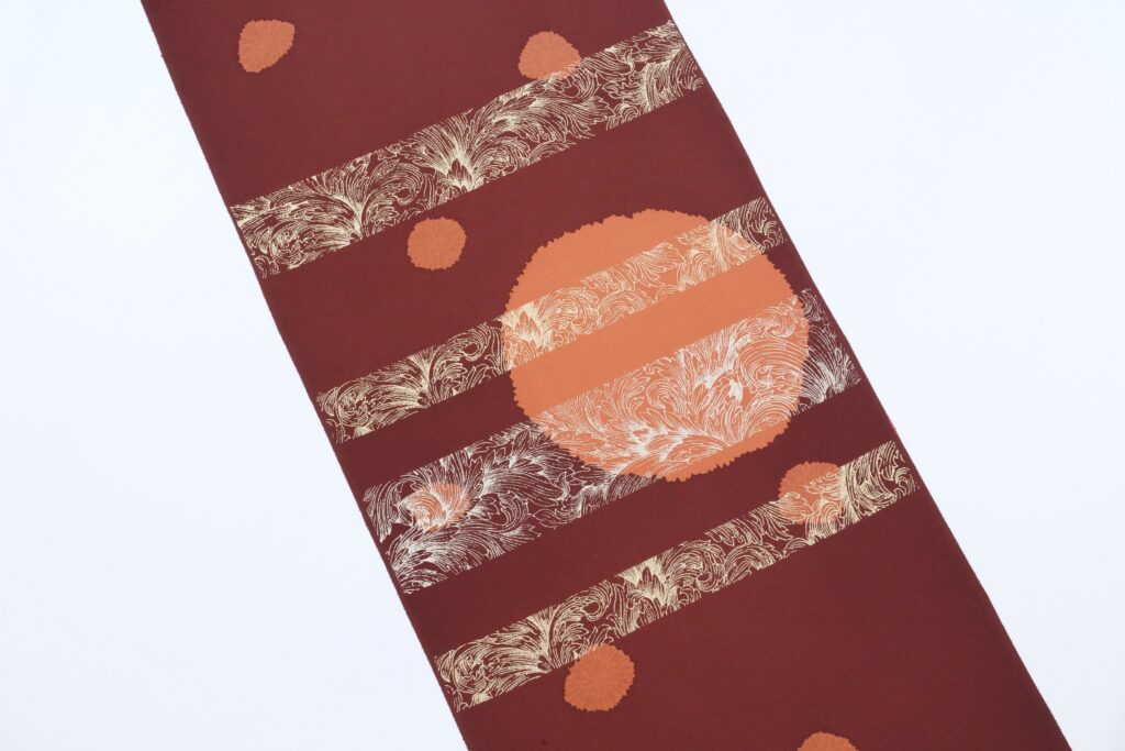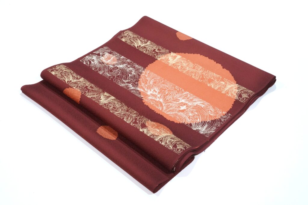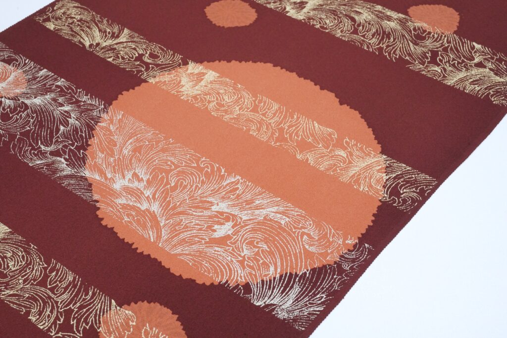 地色の臙脂色と、丸紋の落ち着いた橙色との取り合わせが、