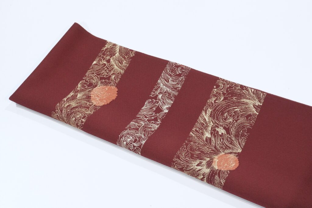 ふっくらとした生地感に細かな紗綾形文様が織り込まれたちりめん帯地を臙脂色に染め、