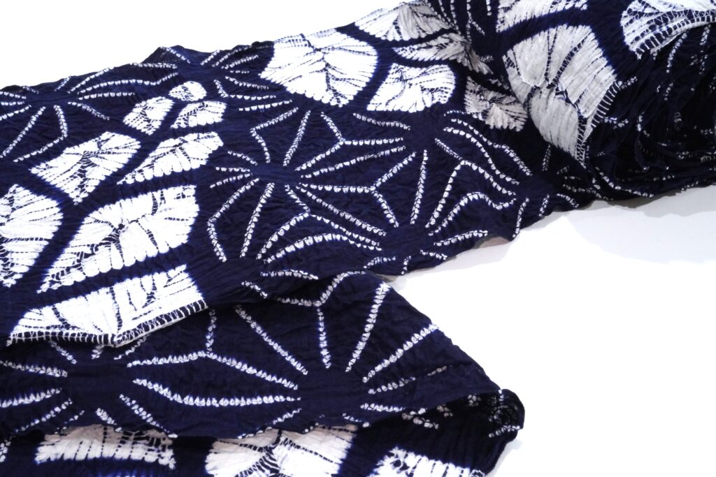 動と静のコントラストをお楽しみください。「有松鳴海絞り浴衣「巻き上げ絞り 麻の葉芭蕉」」
