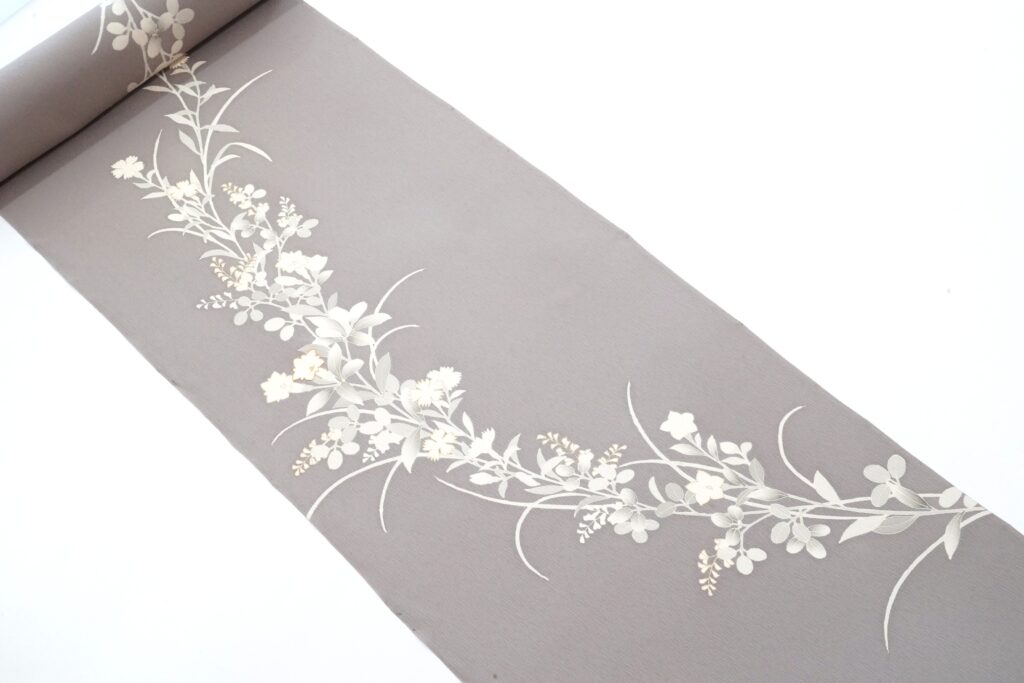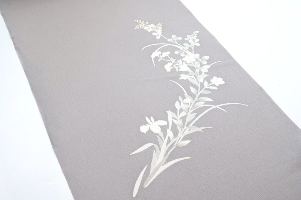 楊柳生地に夏草・秋草を盛り合わせたつなぎ模様を染め上げた、