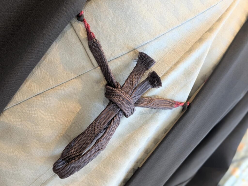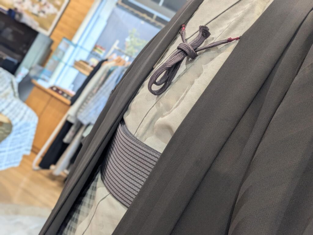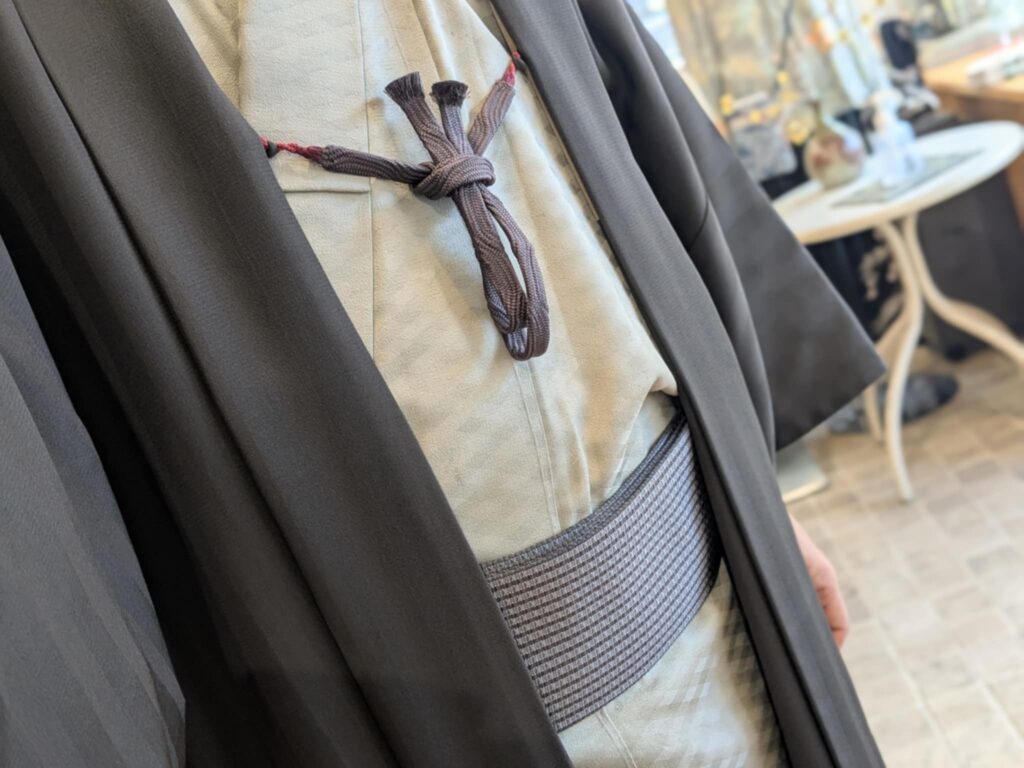 羽織に生地色にも似寄るチャコールの色で組み上げた羽織紐。