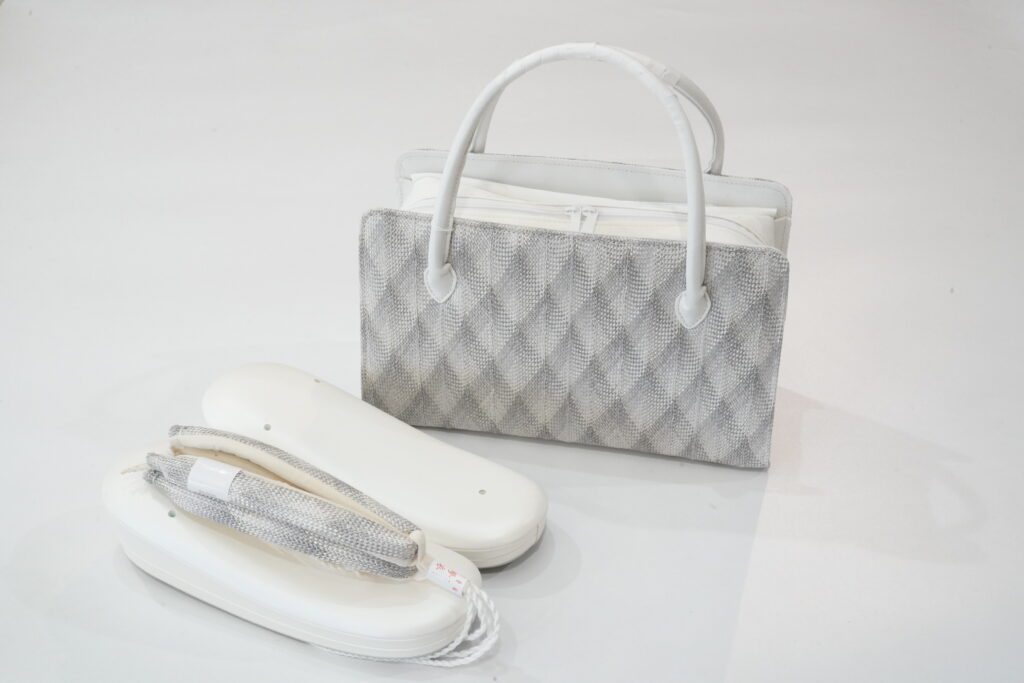 利休バッグ&草履セット「組紐生地使用・バッグ&鼻緒同色同柄生地・薄墨色×白色」