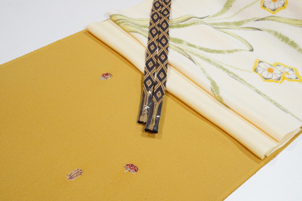 地色は柔らかで暖かな鳥の子色で染め上げてあるので、